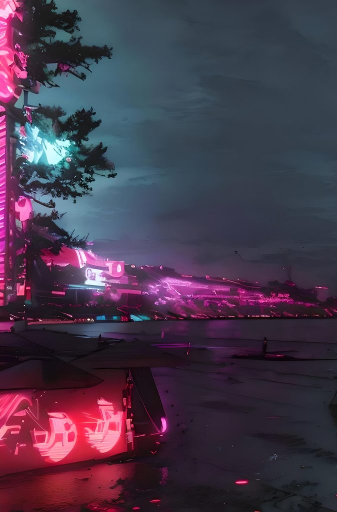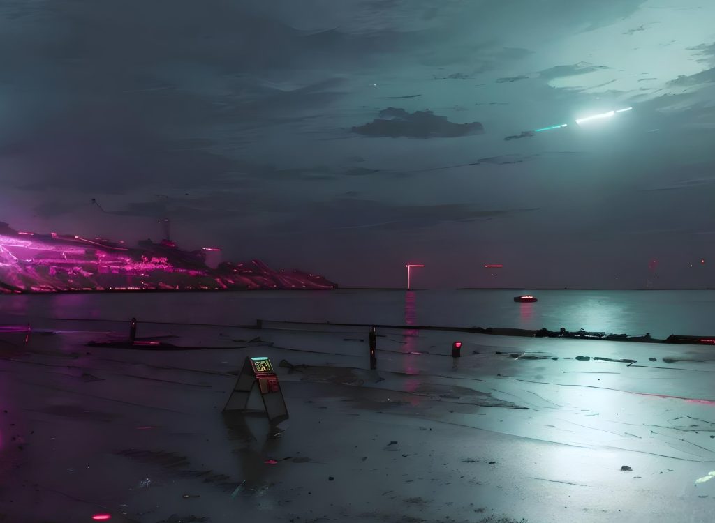 May 12, 2025tropical-cyberpunkBeachDark Beach Dark beach with clouds giving off pink beams. Open sea link Related workBeach lined with tropical plants and rental surfboardsLaser beams emitted from skyscrapers along the beachThe pink shining shore
