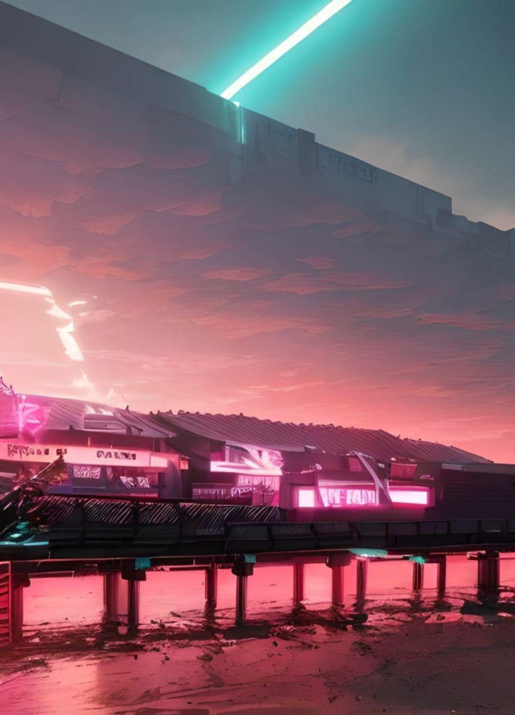 March 13, 2026March 13, 2026tropical-cyberpunkCityThe surface of the sea beneath the pier is stained pink A beautiful scene of the sea surface below the pier tinged with pink. Open sea link Related workCyber ResortHuge building in cyberpunk cityThe large screen that appeared on the pier