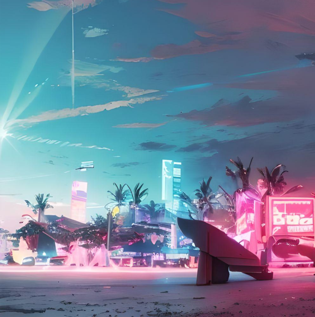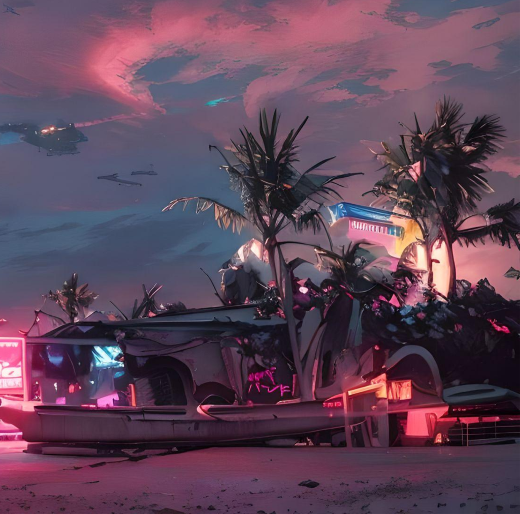 March 25, 2026March 21, 2026tropical-cyberpunkBeachCyber Sunset A beautiful yet hollow light continues to illuminate the false shore tonight as well. Open sea link Related workPale purple sky beachBeach lined with tropical plants and rental surfboardsCyberpunk palm tree
